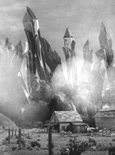 to Earth, creating a large fiery crater. This is the cue for the opening