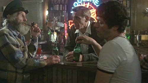 is busy drinking and enjoying themselves. The bartender, a grumpy older